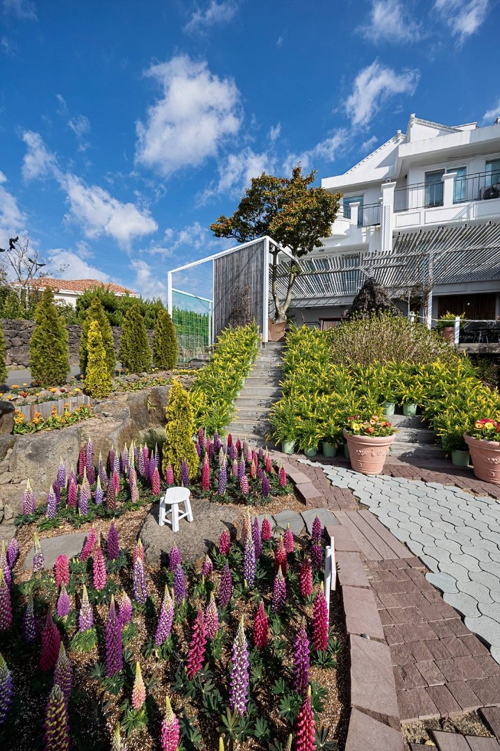 마노르블랑에서는 보라, 분홍, 흰색 등 7가지 색상의 루피너스가 계단식으로 피어나며, 특히 4월 중순이 절정기로 꽃놀이 최적기입니다.